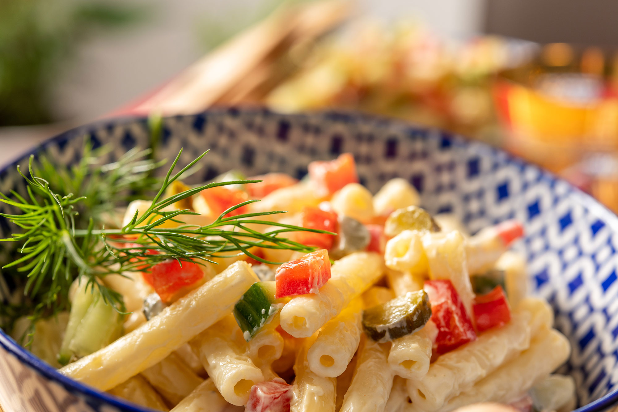 - Koka lågproteinpastan i saltat vatten. Häll av och låt svalna. Skölj grönsakerna, skär dem på mitten och ta bort kärnorna. Tärna paprika, den urkärnade gurkan och den inlagda gurkan fint.Rör ihop mandelyoghurten med majonnäs, senap och citronsaft tills de blir slätt och krydda sedan.Blanda ihop pasta, grönsaker och dressingen. Låt pastasalladen stå i minst 6 timmar.